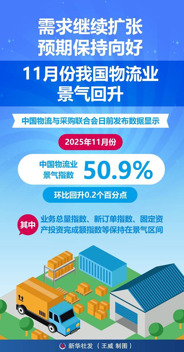 中国物流与采购联合会日前发布数据显示,11月份中国物流业景气指数为50.9%,环比回升0.2个百分点。其中,业务总量指数、新订单指数、固定资产投资完成额指数等保持在景气区间。